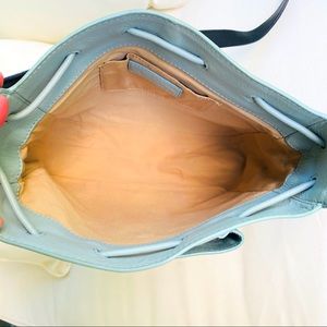 Icy blue leather shoulder bag with gold-tone ring hardware and contrasting strap