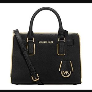 Black Michael Kors top handle structured purse with adjustable shoulder strap. 2 inside pockets. Gold trim all around. Beautiful bag! slight crease as shown in photo