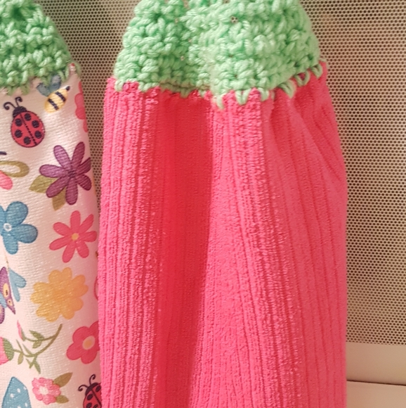 Pretty Pink and Spring Pattern to brighten any kitchen with this cheerful pattern. Crothet top with bright decorative button to hang towel. Top is 100%acrylic and towel is 100%polyester.