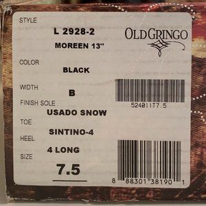 These Old Gringo Moreen Boots are brand new, with tags. As pictured above they remain in the original box and packaging they were purchased in. They are Size: 7.5 and Width: B - Medium. They have never been worn- I purchased them over a year ago and they did not fit and was too late on returning.