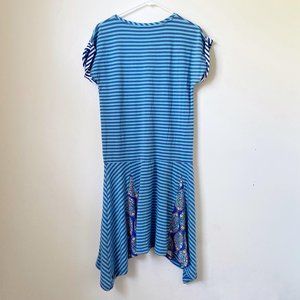 Matilda Jane Blue Striped Walkabout Dress from the Camp MJC collection. Short sleeve blue striped dress with dropped waist with and floral print panels in the front.