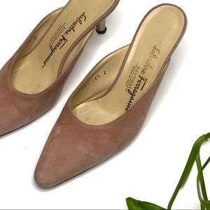 Vintage Ferragamo Pink Suede Kitten Heel Mules