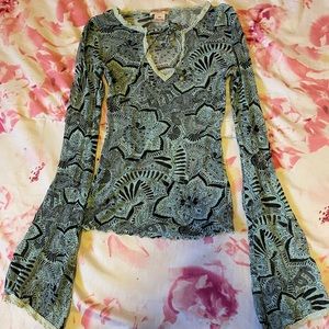 Guess jeans long bell sleeve mesh halter tee/blouse (it’s not see through). These are size small color blue.