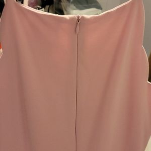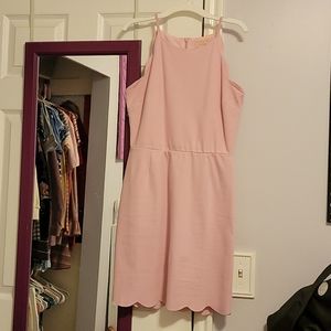 18.5" from waist seam. Baby pink dress with darling scalloped bottom hem. Size medium. 67%Rayon, 28% Nylon, 5% spandex. 100% polyester lining. Zipper back.