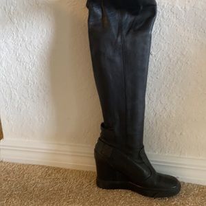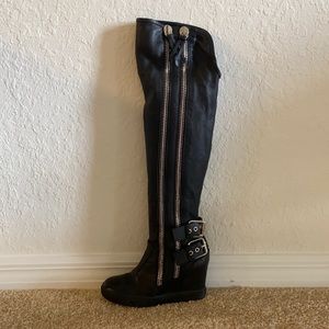 Giuseppe Zanotti leather knee-high boot with silvertone hardware.