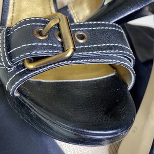 Marc Fisher is known for his classy and chic style! These open toe, black leather shoes are timeless! Size 6.5. Adjustable straps. 4” heels. White top stitching. Comes with the box.They would go great with denim, dresses, jumpsuits, skirts or suits! Besides the underneath, there’s shoes are in great condition! Please feel free to ask any questions! 😊