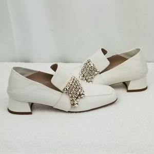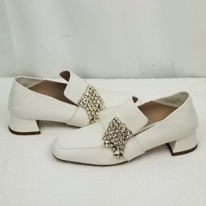 Authentic Stuart Weitzman Swarovski Crystals Embellished White Leather Square Toe Low Block Chunky Heels Pumps Mules size 7 M