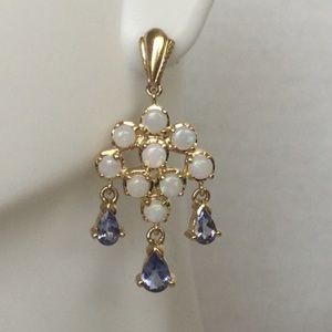 NEW, 10k, 5.3 gm, 7x5m pear shape tanzanite with 3x5mm tanzanite on either side. Along with nine 3mm opals. Post with friction nut in 10k. Excellent condition. These Chandelier earrings look so unique. Fresh, breezy and beautiful! Stamp&checked. Sales support street cat rescue.(35)16