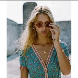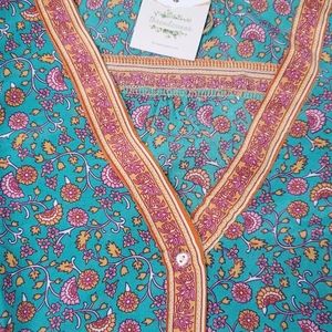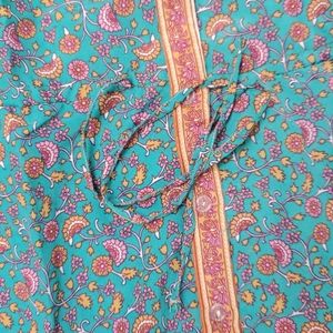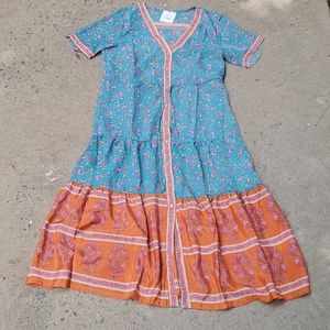 Breezy boho summer style! Short sleeves. V neckline. Button front can be worn closed as a dress or left open as a cardigan layer or cover up. Straight hem. Tiered skirt. Drawstring waist.