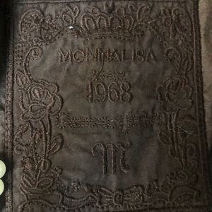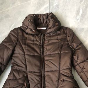 Monnalisa Girls Brown Winter Jacket with Embellishments On Side Pockets and Collar. Zipper front closure and length hits just at knee. Overall Good condition with some change/darkening of color in a few spots on front that are not that visible.