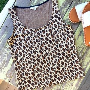 Must have!! Excellent condition, leopard unlined knit tank by St John. Dry clean only. Size is women’s small. Brown, tan and black colors.