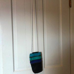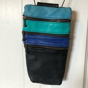 The bag is made of real leather, with three shades of blue and black. There are three zippers on the front with three pouches and one zipper and pouch on the back. Belt loop and strap can be knotted to adjust length.