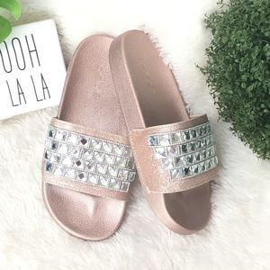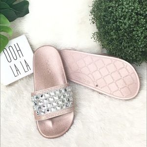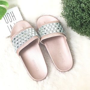 Ultra glam, comfortable, and easy-to- wear, these slides will be your go-to style. Upper: 100 % Synthetic. Outsole 100% Synthetic. 0.5" Heel.