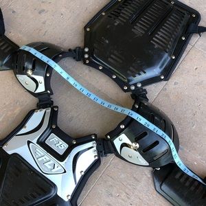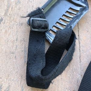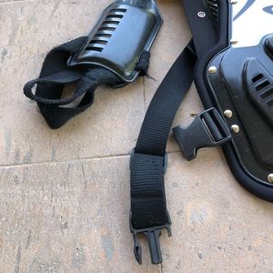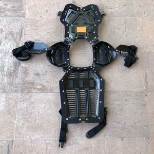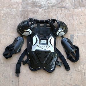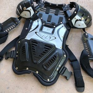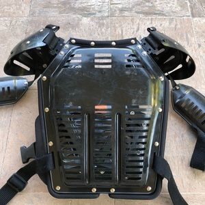 Good condition, but one of the clips is broken on one side, but still clips & on the other side the clip had broken off, so you can only clip one side of the chest. You could probably put a new clip in place of the one that fell off. The fabric for the arms is a little frayed. There is also many scratches on the protector, as you would expect. (Flaws shown in pictures).