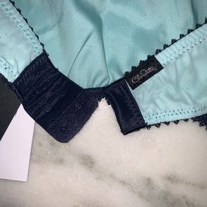 Claudette Dessous Paramour Satin and mesh garter belt. Made to match the paramour bra and knicker set in a Beautiful combination of Sea-foam and French Navy. This had dyed to match elastic stocking holders, color matched metal hardware and Claudettes signature Grosgrain bow. Double hook and eye closure