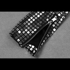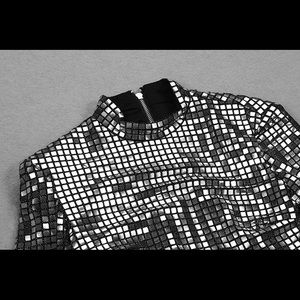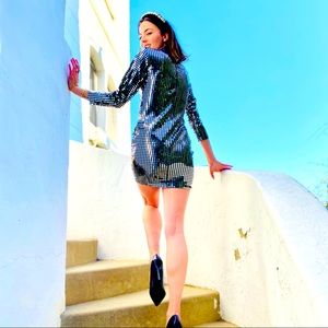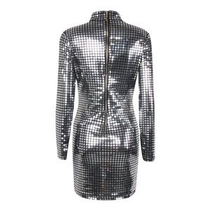 Gorgeous sequin mirror disco ball dress features 3/4 sleeves with zipper cuff detail, mock collar, back zip closure. Very reminiscent of the Taylor Swift dress! Enjoy!