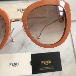 Brand new authentic Fendi oversized burnt orange square sunglasses. Burnt orange striking frames with gold side arms and large gold f logo . Show stopper shades retail $505 . Comes with case , dust cloth and card of authenticity. Case color varies