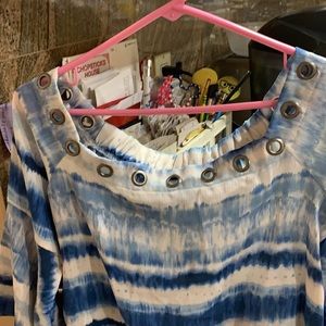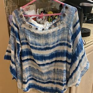 Brand new blue and cream bell sleeve blouse Gorgeous!!!! Size small. Bought from a high end boutique
