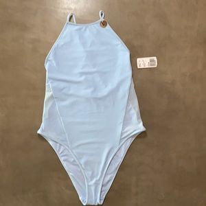 Fashionable sexy high leg one piece swimsuit never worn crotch sticker still intact and tags sexy side mesh panel cross back. Mint condition