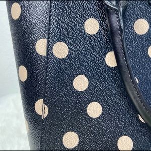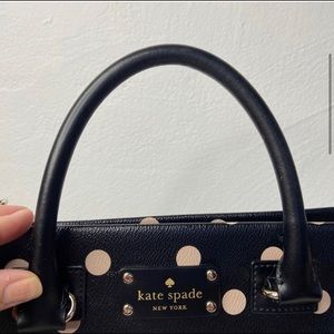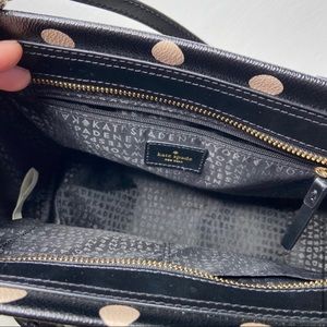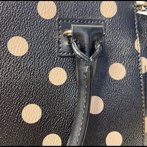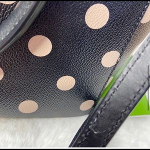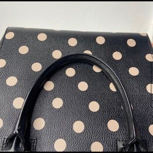 KS leather tote with black leather and tan/nude color polka dots. Love this purse as it is a tote bag with handles or can be a cross body with long and adjustable straps. If you’re tall or blessed with a chest, this bag will suit you!