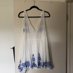 White Free People Intimates top/dress/beach cover up. Embroidered blue floral all the way around the bottom. Lace up chest, used