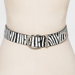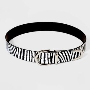 Black and white belt finished in a zebra print. Silver-finished buckle sports a rounded shape and helps you find the right fit.