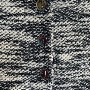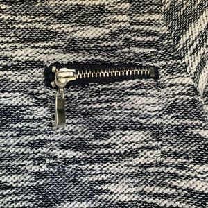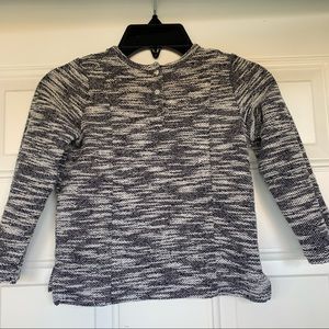 This is a lightweight marled navy blue/white sweater from 7 For All Mankind, size 3T. This top is made from soft cotton/polyester knit and features long sleeves, zippered chest pocket, signature snaps on the back, and side vents. This is a perfect piece to transition between seasons, and wear on chilly summer nights!