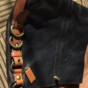 Sturdy, rugged, black pebbled leather hobo bag with contrasting tan belted trim and shoulder strap. Durable brass hardware, grommet details, toggle closure at top. Like new. Clean, beige canvas lining with two pockets on one side and enclosed zipper pouch on other side of interior.