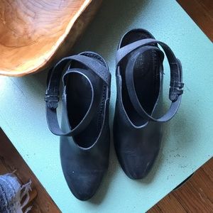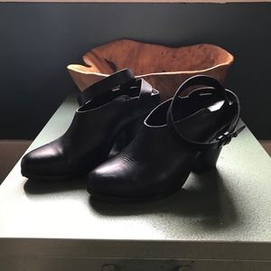 Rag & Bone Kenny leather mule booties. Leather ankle wrap with push pin closure, closed almond toe, leather upper and lining, made in Italy. 3" heel Size 35 Euro / 5 US