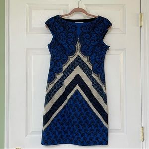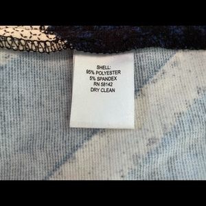 London Times blue, black and gray lace print dress, size 8P. Side zip. A few very slight picks around the neck where a necklace was worn, but they are hard to see. Size zip. 95% polyester, 5% spandex. Dry clean.