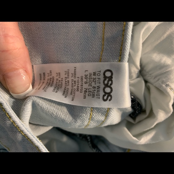 These are a light wash Jean by ASOS. These are light washed nice jeans. Worn a few times. They are size 32x30. There is a stain on the front top of one of the legs. Otherwise these jeans are like new.