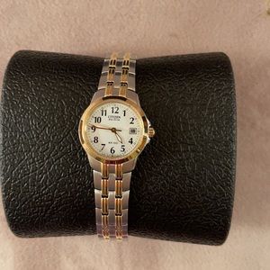 NIB Citizen tutone gold and silver watch. Features a second hand, date, and adjustable band. Please review all pictures carefully.