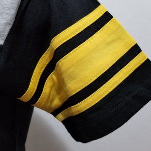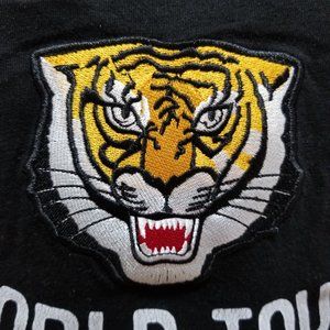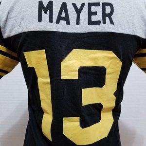 Vintage-inspired John Mayer Born and Raised World Tour football jersey. Features woven tiger patch on front. Text is printed in a brittle ink that uniquely distresses on each shirt. "MAYER" & "13" printed on back.