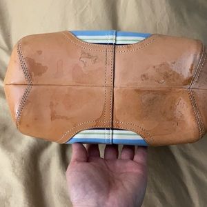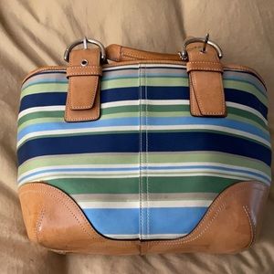 Bring on the sunshine with this leather-trimmed bag and matching wristlet. Blue, green and cream stripes complement the tan leather and silver buckles. Zip top. Inside zip picket and two open pockets. Includes original dust bag and cate instructions. Bag 8x13x5, wristlet 4x6. Checkout my closet - I bundle, you save!