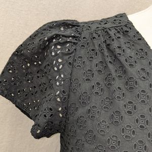 Gathered short sleeves and shoulder, cinched waist with elastic on the back, v neck and button front