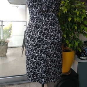 Comfortable, professional cap-sleeve knit dress is self lined in bodice, so it avoids being clingy or showing bralines. Polyester with soft drape and gentle give. Great and easy all day work wear, wrinkle resistant, stretch, flattering to curvy figures. Hits me at about the knee in a 5'5" frame, looks and feels good on me at 38C, 31" waist, 41" hip.