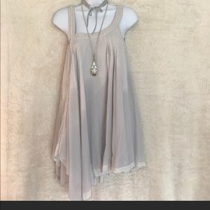 This garment is a MUST HAVE. Asymmetrical hem, layered & flowy. Soft fabric. Feminine & flirty! EUC. Zero flaws. Bought at Urban Outfitters, Soho, NYC. Light dove gray color with white treading.