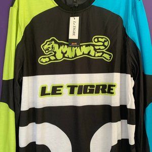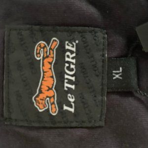 # 642- Very colorful men's XL Le Tigre. This t-shirt measures 30 inch from shoulder to hem & 23.5 inch from armpit to armpit. Easy care, machine washable.
