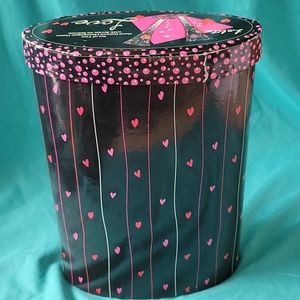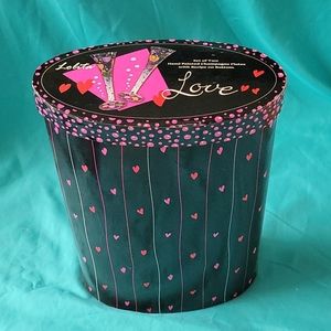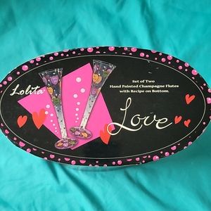 10inH × 3 1/8 rim and 3in base hand painted hearts and arrows marriage proposal champagne flutes. Brand new never used. Top foam is broken but integrity good. Also small tear on the lid. They have cocktail recipe on bottom of both bases and the bottom of the box.