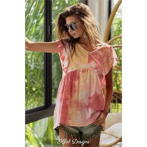 TIE DYE SOFT COTTON JERSEY KNIT WITH RUFFLED SLEEVE BABYDOLL TOP!