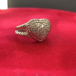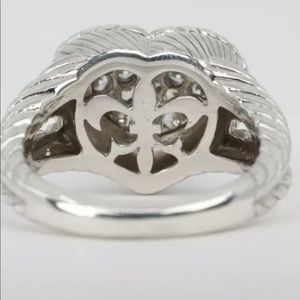 Judith Ripka is a well-known name in the jewelry industry for her works in silver. This is one of her well known rings. This is a beautiful sterling silver ring in the shape of a heart with cubic zirconia set in a pave style with rope design on sides. Detailed even inside the ring. This is a classic love and heart ring that can be worn daily or for special occasions.