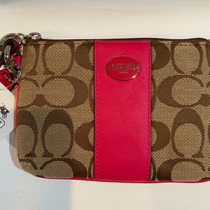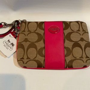 Coach wristlet. Tan signature print, hot pink vertical center stripe, strap and trim. NWT