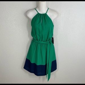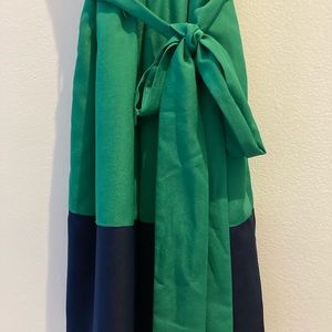 Excellent condition. Green dress with an elastic waist band with a matching green sash. Keyhole .Blue trim at the bottom. Dress is lined and buttons at the back. This dress has hidden side pockets. Shimmery polyester material.