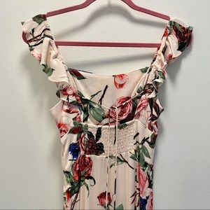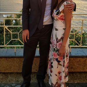 Flattering summery midi dress with ruffled straps. The material is lightweight and fits to the body without being too tight. Dainty ties in the back with gold heart hardware. I’m 5’5” and it hits 2-3inches above my ankle.