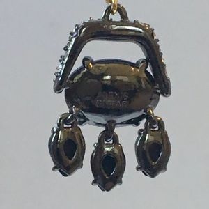 A trio of claw like prong set, teardrop shaped, faceted pyrite stones dangle from lapis lazuli cabochon.