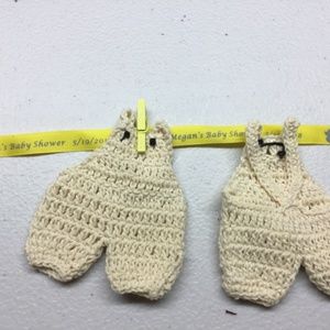 These little hand made crocheted girls jacket and boys overalls are an absolute hit at a gender reveal party or a baby shower. I used them on a clothes line across a fire place mantle and on the gift table and my guests could not help but touch them and notice the special handiwork.
