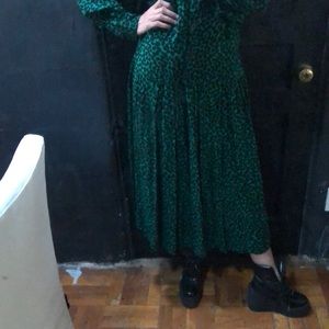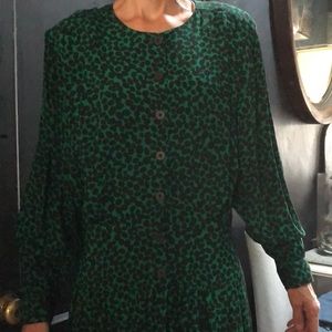 VINTAGE EVC emerald green cheetah print long sleeved dress, size S (probably will also fit a medium) by MENU purchased from famed Playclothes vintage store (the store Lana del Rey frequents!). The colors are gorgeous (!) emerald green and black, fabric is silk-like, high quality and perfect VTG condition. Cut is 1980s does 1940s, w/shoulder pads. A perfect piece for your collection! This can be dressed up or down! Similar to Christian Dior, Batsheva, Vampire’s Wife, ModCloth, Top Shop, Gothic Witchy Cottagecore, rockabilly, whimsygoth, Gucci FW2025. Big shoulders, small waist, perfect on trend for fall! 🐦⬛🎸🫦🫦🫦 looks like Gucci FW 2025