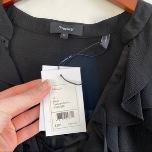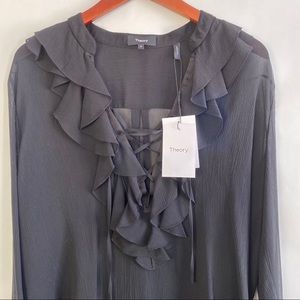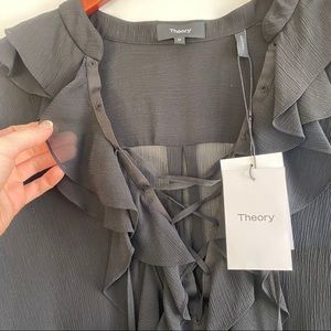 NWT is this 100% silk chiffon lace up ruffled blouse by Theory. Size Medium. Hi-low design