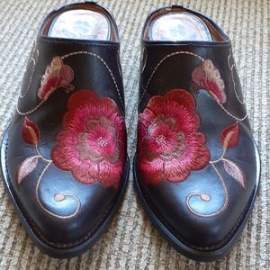 Lucky Brand "Lk-Cathy" Slip Ons. Pink Flower Embroidery over dark brown leather. Size 6. Great condition. Gorgeous shoes!