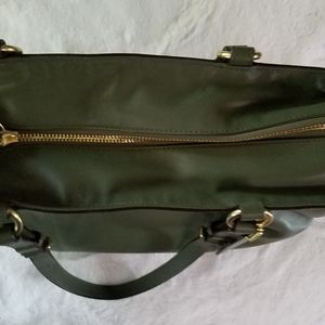 Authentic Coach, leather, olive green shoulder bag. Very beautiful rich color. Gold Hardware, adjustable shoulder straps, 1 large pocket on back, 3 interior pockets, dark chocolate interior lining, logo tag attached, and two pockets on each side. Approx. measurements - 11.5 W, 9 L, 4.5D, 9.5 strap drop. Never used, carefully stored, smoke-free home. A true vintage item. Ship to USA address only. No PO box.